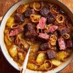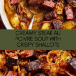 Steak Au Poivre Soup is a rich and luxurious soup inspired by the classic French steak au poivre. It combines tender, pepper-crusted steak pieces with a creamy, flavorful broth made from cognac, beef stock, and baby potatoes. Crispy fried shallots on top add a satisfying crunch, making this soup an elegant and comforting dish perfect for special occasions or a hearty meal.