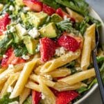 A fresh and vibrant Strawberry Avocado Pasta Salad combining tender pasta, sweet strawberries, creamy avocado, peppery arugula, and tangy feta cheese, all tossed in a luscious poppy seed and Greek yogurt dressing. Perfect as a light lunch or a refreshing side dish served warm or chilled.