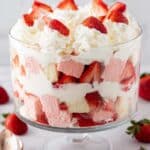 - Decorate the Trifle: Pipe or mound large dollops of the whipped cream around the top of the trifle. Pile the reserved strawberry slices in the center. Add one more dollop of whipped cream in the center and top with a halved strawberry with the stem still attached or arrange as desired for presentation.