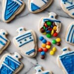 Celebrate the holiday season with these whimsical Sugar Cookie Dreidels! Crafted from tender sugar cookie dough and hand-cut into dreidel shapes, these festive treats are layered and filled with colorful M&M’s Minis. Finished with a glossy vanilla frosting glaze and decorative blue and white icing, they make a perfect dessert centerpiece for Hanukkah celebrations or any festive occasion.