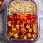 - Assemble bowls: In serving bowls, layer cooked brown rice, sautéed vegetables, and sweet chili tofu.