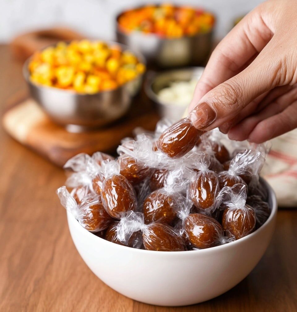 Keep the wrapped tamarind candies in an airtight container at room temperature for up to 2 weeks. They can also be refrigerated to extend freshness. When ready to eat, bring them to room temperature for best texture. No reheating is needed.
