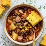 Texas Cowboy Stew is a hearty, protein-packed stew featuring crispy bacon, lean ground beef, smoked sausage, beans, and tender potatoes simmered in a flavorful broth seasoned with cumin and chili powder. This rustic, comforting dish brings bold Texan flavors to your table, perfect for a filling family meal.