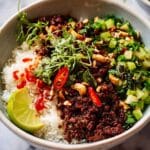 - Assemble the Bowls: Spoon cooked jasmine rice into bowls. Add a portion of the caramelized beef mixture on top. Arrange steamed or fresh veggies like chopped cucumber, finely sliced red onion, and extra coriander/cilantro on the side.