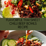 Thai Sweet Chilli Beef Bowls are a vibrant and flavorful dish perfect for a quick weeknight meal. Tender beef mince is coated in a tangy, sweet chilli sauce and served over fragrant jasmine rice with fresh veggies and crunchy cashews. This recipe brings a delightful balance of sweet, salty, and zesty flavors in every bite.