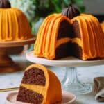 This Great Pumpkin Bundt Cake is a festive and moist fall dessert featuring a spiced pumpkin cake baked in mini Bundt pans and decorated to resemble a pumpkin. Enhanced with warm pumpkin pie spice and rich brown sugar, the cake is layered and frosted with a smooth vanilla buttercream tinted a bright orange hue. The final touch is a chocolate-coated ice cream cone stem atop the cake, making it a charming centerpiece for autumn celebrations or Halloween parties.