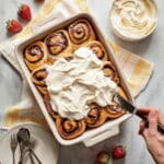 - Serve: Spread the icing over the soaked cinnamon rolls. Dust with ground cinnamon and optionally garnish with fresh strawberries. Serve immediately.