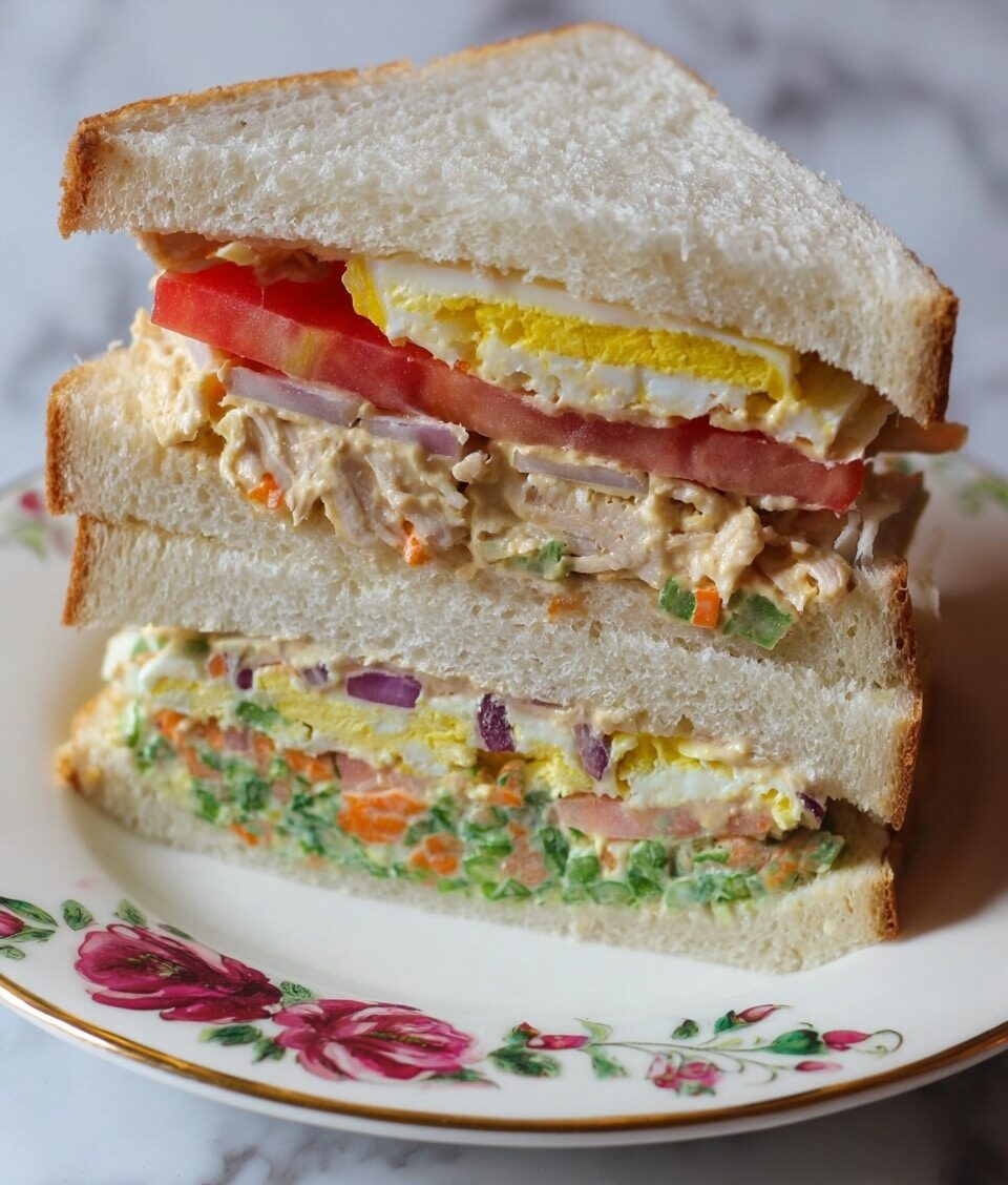 This Triple Club Sandwich is a delicious layered sandwich featuring a combination of fresh veggie filling, seasoned egg, and creamy chicken filling sandwiched between buttery toasted bread slices. It offers a perfect blend of textures and flavors, making it an ideal hearty snack or light meal.