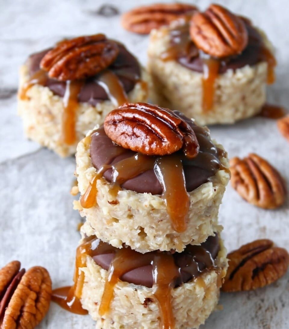 - Step 2: Place one Rolo candy and one whole pecan on top of each cookie, pressing down gently to secure.