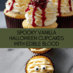 Keywords: Vanilla Halloween cupcakes, Halloween dessert, spooky cupcakes, vanilla buttercream, edible blood, mummy cupcakes, holiday baking