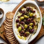 Keywords: whipped feta dip, roasted olives, appetizer, Mediterranean dip, easy party dip, feta and yogurt dip, roasted sun-dried tomatoes, savory dip